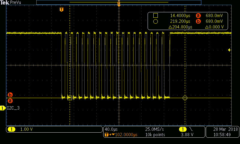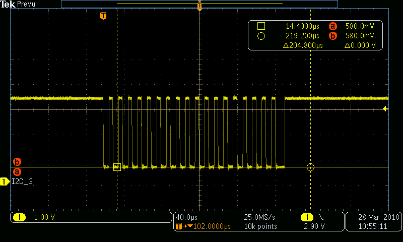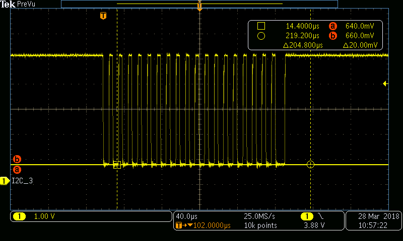 我假设最后一幅偏移为180mV 的图片是连接到主器件和 TCA9406的图片。 对于3.3V 电源和2k 上拉电阻器、该偏移有点大。 这使得下拉 FET 的 Ron 看起来大约为100欧姆、这非常大。