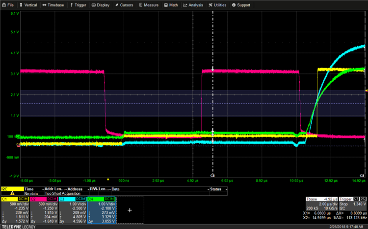 TCA9802可与铜缆完美配合、但在测试光纤电缆时、DDC 线无法连接。 已连接您会看到 DDC 线路的行为:蓝色:SDA@拉电流、绿色:SDA@TCA9802Aside、黄色:SDA@TCA9802Bside、红色:SCL@ TCA9802Bside。