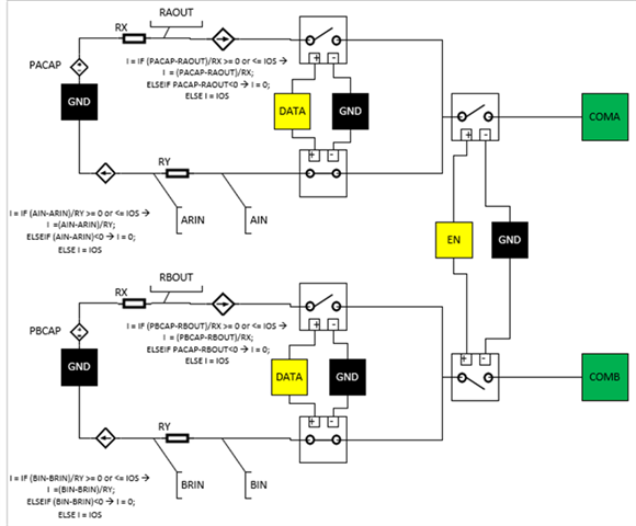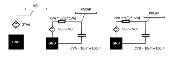 PACAP 和 PBCAP 充当源-它们的最大值是驱动器的近似开路电压(作为 RS-485驱动器、空载时将输出~VCC - 2个二极管压降) -但他们有一个内置的 RC 上升/下降延迟来模拟驱动器的转换时间-这在模型图像中解释-但如果你不关心的时间,你只需用等于 VCC - 2的电压源替换 PBCAP 和 PACAP 二极管压降-由于此器件没有开路 VOD 规格、因此我将使用0.3V 作为二极管压降值、并且电压源可以设置为 VCC - 0.6V。