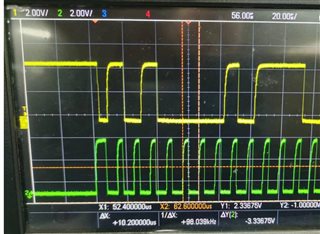 下图显示了 MCU 和 EEPROM 之间的 IIC 通信波形。 fclk=100kHz、VCC =5V 时的波形、对于 SDA 为黄色、对于 SCL 为绿色。