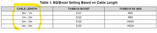 这些设置在一定程度上取决于系统、电缆长度和系统损耗。 不过、在 TUSB216数据表中、我们确实有关于根据前置通道和后置通道长度进行设置的一些通用指南。