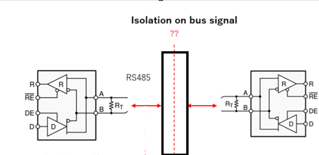 您是否可以建议任何变压器耦合或其他隔离方法为 RS485的总线信号提供电隔离 ? 请注意、一个 RS485收发器正在连接到另一个 RS485收发器。 不采用菊花链连接。