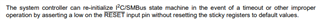 '在发生超时或其他不当操作时、系统控制器可以通过在 RESET 输入引脚上置为低电平来重新初始化 I2C/SMBus 状态机、而无需将粘滞寄存器复位为默认值。'
