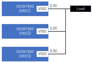 通常、电源输出不能直接连接在一起。 为此、电源需要具有称为"负载共享"的特定功能。 ISOW7840没有此功能、因此无法将输出直接连接在一起。