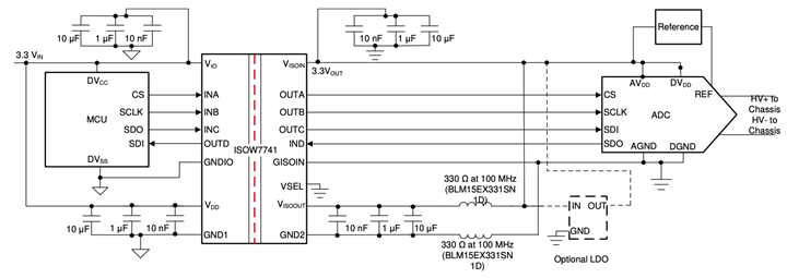 请参阅以下数据表中的应用图、其中显示了为数字隔离通道和 ADC 供电的 ISOW7741。