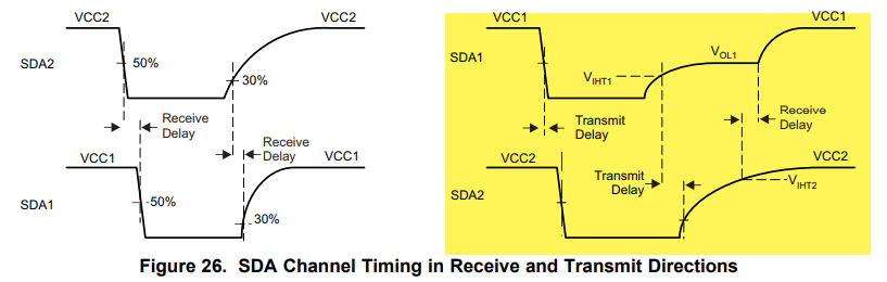 • 当比较器 C 变为高电平时、SDA2在发送方向延迟后被释放。 它需要另一个接收延迟,直到 B 的输出变为高电平并完全释放 SDA1,从而向 VCC1电位移动。