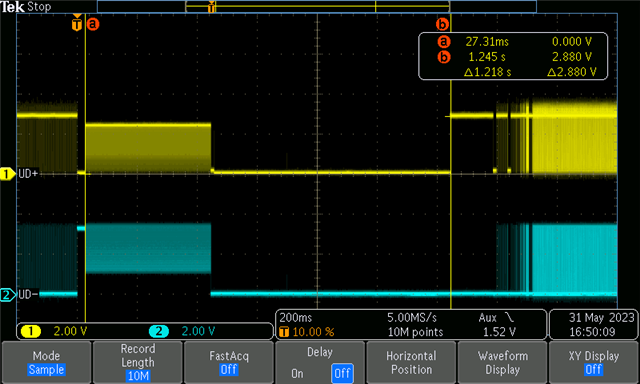 在某些情况下、在移除连接下游的 USB 器件并与主机发出的1ms 帧起始(SOF)时序信号同步时、可能会在上行侧观察到异常序列。 此时、发生下游的 DD (+、-)=(L、L)信号不会直接传输到上行侧。 首先、它变为 UD (+、-)=(L、H)、然后转换为异常波形、最终变为 UD (+、-)=(L、L)。