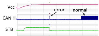 我发现当部件上电时、在等待 RX/TX 激励之前、CAN 输出切换一次。 这种情况在电源启动时发生。 最初、STB 引脚连接到地。 然后、我将 STB 引脚拉低了大约100ms、脉冲随 STB 移动。 这个加电脉冲有时会在 PC 工具中导致错误、所以我想办法解决这个问题。