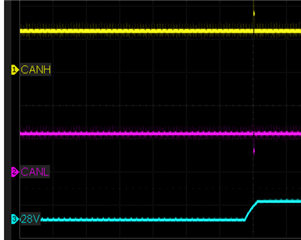 从上面的波形可以看出、当 STB = LOW 时、CANH 默认保持隐性(~2.5V)、当 STB = HIGH 时进入 Hi-Z。 当 CANH 为 Hi-Z 时、该电压会降至0V、一旦 STB 变为低电平、该电压便会恢复到~2.5V。 我没有在您的波形中看到该预期行为、也没有在波形中看到任何时序详细信息。 请务必提供与您的测试条件相关的更多信息、以便我可以确认我的测试是否与您的匹配、如果不匹配、我可以尝试重新创建您的测试条件。