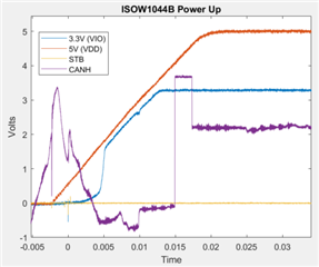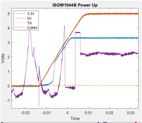 我想重现此问题、并且为了让我能够做到这一点、我将提供具体的详细信息、以便我可以使用完全相同的条件进行测试。 具体信息、例如 ISOW1044的 VDD 从0V 到5V 的斜坡时间是多少、STB 保持在低电平或高电平后几微秒或几毫秒、以及此事件后 CAN 总线上发生毛刺脉冲数。 显示时间和电压刻度的波形应提供此信息。