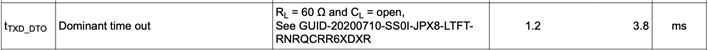 CAN 标准要求 CAN 总线在不使用时保持隐性状态(逻辑高电平)、仅在总线上传输数据期间变为显性状态(逻辑低电平)。 在所有其他时间、它应保持隐性状态(逻辑高电平)。 如果总线意外地被强制进入显性状态(低电平)超过1.2ms、则显性超时(DTO)将开始生效、将 CAN 总线从显性状态释放、并强制其进入隐性状态。 数据表中 DTO 的额定值如下所示。