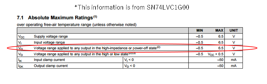 SN74LVC1G00与SN74LVC14A系列相同,也显示了应用于高阻抗或断电状态中任何输出的电压范围。