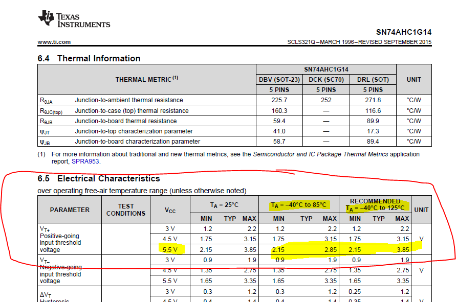 您能确认以下内容是否正确。 正输入电压阈值(VT+)中的“摆幅” 在温度范围内的容差比在室温下的容差更小? 您能否详细说明数据表规格的方式?似乎唯一的变化是在5V Vcc -40C 至85C 的条件下