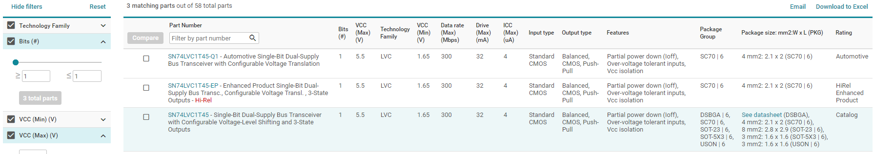 通过过滤到"Bits (#)= 1"和"VCC (Max)(V)=>5.5"、您可以得到以下部件的简短列表: