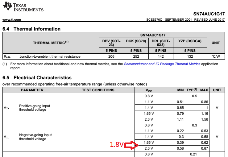 我是否可以从您那里了解 到、在1.8Vcc 期间、我们是否有任何器件具有比 SN74AUC1G17更低的施密特负向输入阈值电压?