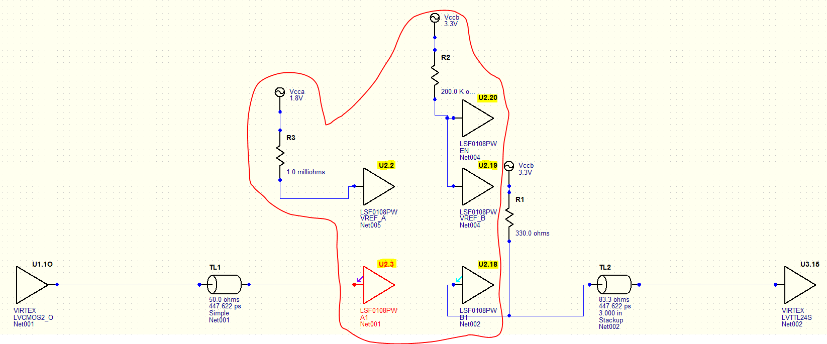 我使用 LSF0108进行从3.3V (A 侧)到5V (B 侧)的单向转换。 在 Hyperlynx 中进行 SI 分析时、当我将 IBIS 模型分配给 B 侧引脚时、由于 LSF0108的 IBIS 不会对输出建模、因此它不会提供将其分配为输出的选项。 无论 A 侧的输入如何、B 侧的输出始终保持低电平。 我尝试通过从数据表中查找输出模型参数并复制 I/O 模型的 I-V 和 V-t 数据来定义 IBIS 文件中的输出模型、但它仍然不起作用、并且输出始终保持拉低。 A 侧 D 型锁存器(器件型号:IDT74ALVCH162373)的输出端连接。  请问我的电路或 IBIS 模型是否有问题?