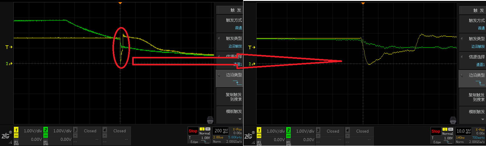 我的客户现在正在使用 TXS0108、发现异常问题、波形低于、B 侧为3.3V、此时 B 侧压降非常缓慢。 黄色表示 A 侧1.8V 将快速下降并再次上升。 客户对这种现象感到担忧。