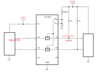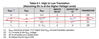 2.在输出端口(Sn)侧没有电压源(上拉电阻)。 当输入端口(DN)侧为高电平时、输出端口(Sn)如何使 VTT 电压电平?