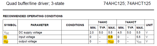 3. 如果74HC125与5V 输入不兼容,则另一型号74AHC125的规格为0~5.5V。 当 Vcc 为3.3V 时、 VI 是否可以 为5V TTL 电平?