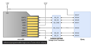我们基于参考设计(ZC702 v1.0和 Digilent Cora Z7)设计了 AMD/Xilinx Zynq-7000转 micro-SD 卡接口。 Zynq 使用1.8V 的 MIO 接口、micro-SD 卡为3.3V。 就像其他人一样、我们使用 TI TXS02612作为它们之间的电压转换器(VT IC)。