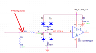 此外、我们向下面的电路中注入了5V 摆幅、经测量 U9处的输入电压为-0.07V ((max)最小值为3.63V)。 我要确认以下几点: