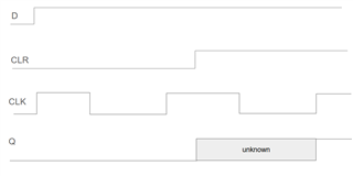 我需要选通上升沿并计划使用~CLR 引脚来提供选通功能。 当 D 连接到逻辑高电平时、应在 TPP 后的 Q 上表示~CLR 被拉至逻辑低电平后 CLK 上的下一个上升沿。 如果在 CLK 已经为逻辑高电平时将~CLR 拉至逻辑高电平、则稍后 Tprop 中将出现什么状态 Q? ~Δ V PRE 始终为逻辑高电平。
