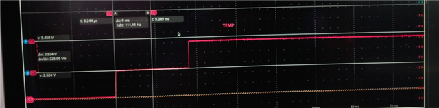 SN74LVC1G32的引脚4显示电压阶跃2.9V 且持续15ms、而不是预期的5V。