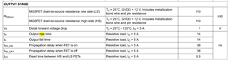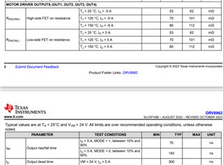 如下表所示、DRV8962 RDSonh 和 RDSonl 会随结温的不同而变化。 此外、它有两个上升和下降时间模式。 要一起比较这些器件、应在特定条件下进行。