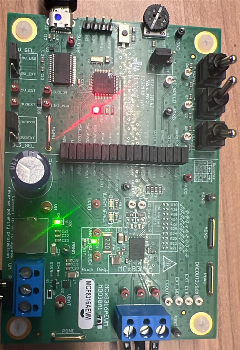 我尝试对我的 BLDC 电机运行 MCF8316AEVM、但没有成功。 我已根据指南设置开关和跳线、但电机未运行。 我还尝试过使用 GUI 应用程序来控制它、但没有成功。