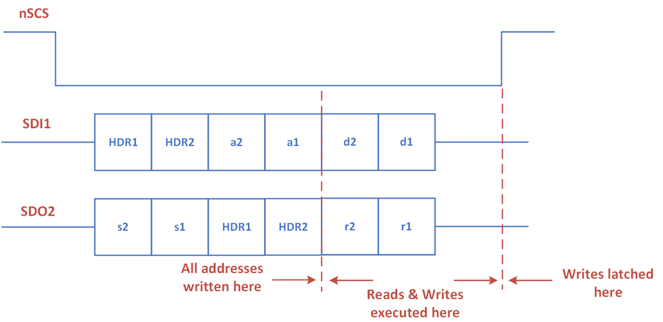 您使用的标头0x82A0看起来很好、使用全局清除。 在通过 SPI 传输标头时、您会收到器件1和器件2的状态字节。 对于链中的2x 器件、SPI 事务的其余部分应如下图所示。 务必确保 nSCS 符合如图所示的合规性。 在发送地址 A2和 A1时、返回的字节应为最初发送的标头字节。 如果这与 MCU 中的 SPI 协议不匹配、则未正确配置以匹配 DRV8908-Q1器件的要求-请参阅第二个数据表中的图像。 该时序图中显示了针对单个器件对等 SPI 事务的 nSCS、请忽略所示的 nSCS、因为该值对于菊花链来说会有所不同、如前所述。