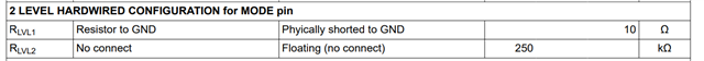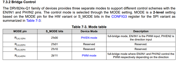 3. 数据表显示、如果硬件版本芯片可调整为 PWM 模式、则只能通过调整硬件版本的 MODE 引脚将 DRV8242-Q1设置为 RLVL1OF4和 RLVL2OF4?