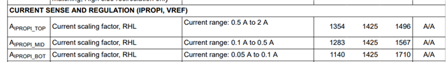 2. 与数据表以下部分的说明混淆。 我想知道下图中的电流范围是否指的是输出电流吗? 我看到(max)为6A、如果电流范围为2A-6A、电流比例因子应该是多少?