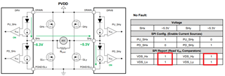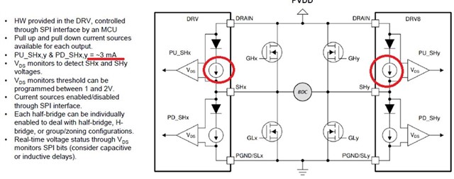 2、 附件的离线诊断针对全桥、只有 PMOS 的上拉电流源和 NMOS 的下拉电流源被打开。 故障仅为单个开路/对地短路/对电源短路。 如果全桥需要同时检测多个故障、我们是否需要配置 PMOS 和 NMOS 的上拉和下拉电流源?
