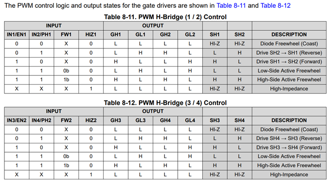 我计划使用2个 BDC 电机、通过 H 桥电路由微控制器的 PWM 输入进行控制。 可从的数据表中找到 DRV8714-Q1、我在下表中提到过、其中提到的输入状态不会清零