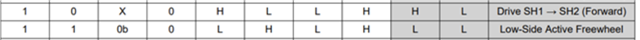 我想在输入 PWM 状态为低电平时将 H 桥用作低侧有源续流、当输入 PWM 状态为高电平时、电机将由半桥1的顶部 MOSFET 和半桥2的底部 MOSFET (电机正向旋转)供电。 上表展示了输入稳定的高电平/低电平时 H 桥的输出状态。