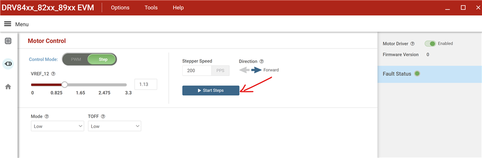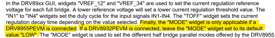 我尝试在圆圈内的绿色区域中选择"Step"。 电机线圈中心抽头未连接到任何电压、并且电机能够在启动后运行。 这似乎像是 CPU 正在仿真双极驱动方法。 不过、由于所选器件为 DRV89xx (这种器件理论上与这种驱动方法不匹配)、为什么电机仍然能够运行?