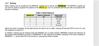 如果 BRKMOD=0、则输出为三态、从而导致电机滑行。如果 BRKMOD = 1、则所有低侧 FET 都导通、从而导致电机制动。