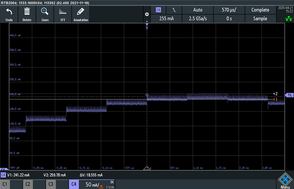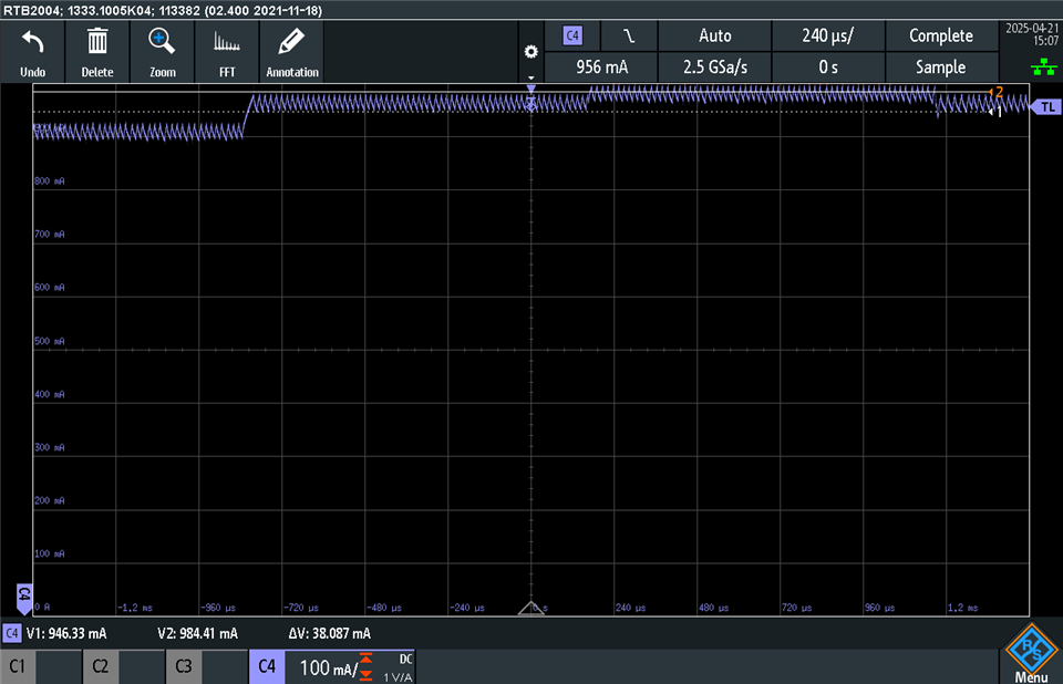 请参阅下面在最大 IFS 的25%、IFS = 250 mA 时捕获的波形、其中显示了~ 19 mA 处的纹波振幅、 该振幅非常接近预期值。