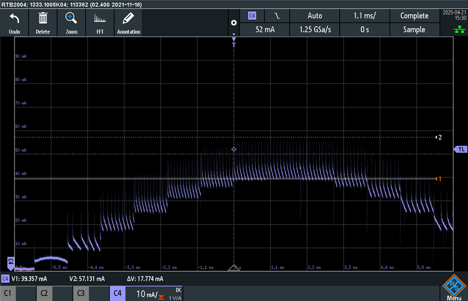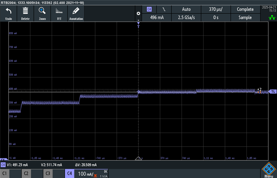 请参阅下面在最大 IFS 50%、IFS = 500 mA 时捕获的波形、其中显示了~ 20 mA 处的纹波振幅、该振幅非常接近预期值。