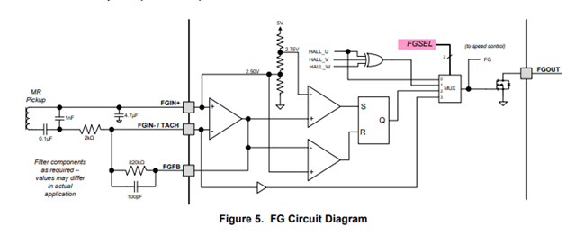 • FGSEL = 00/01 :来自霍尔传感器的反馈(从霍尔边缘产生的数字 FG 脉冲)