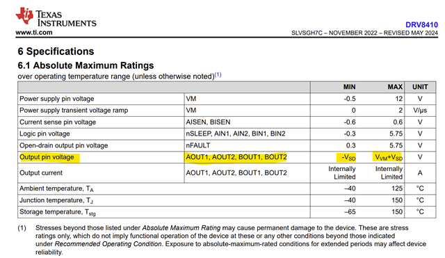 请参阅下面的绝对最大值 器件的 AOUTx 和 BOUTx 引脚的规格。 根据此、这些引脚上的电压必须介于–1V 至 VM + 1V 之间、否则将损坏。 如果电机端子产生低电压、它可能会通过输出 FET 体二极管为 VM 大容量电容器充电、进而会增加 VM 电压电平。 只要 VM 小于其绝对最大值 xOUTx 在其绝对最大值范围内 不会损坏驱动器。 如果为 ABS。 如果超出最大值、则可能会损坏器件。