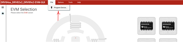 感谢您发送编修。 这应该不是问题。 客户正在使用哪个版本的 GUI? 我们可以要求客户试用在线版本吗?  https://dev.ti.com/gallery/view/MotorDriversBSM/DRV84xx_DRV82x2_DRV89x2-EVM-GUI/ver/1.0.3/。如果是桌面应用程序、请确保使用 1.0.3 版本。 在尝试将 GUI 与 EVM 连接之前、请使用 File > Program Device 菜单更新 EVM 固件。