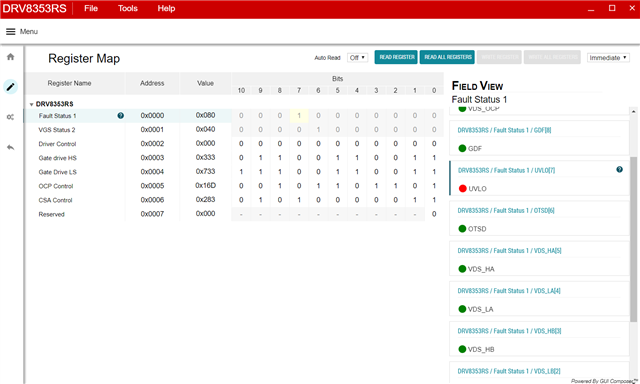 我目前正努力使用寄存器 0x03 和 0x04。 我想更改 IDRIVE 电流值。 我可以更改 GUI 中除这些值之外的所有内容。