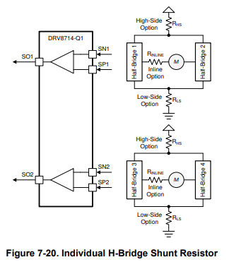 由于 DRV8718-Q1 只有两个电流收集通道、我们担心技术细节、例如如何收集所有八个电流通道、如何选择额外的采样运算放大器和电阻器、以及如何放置采样电阻(底面,高侧和直列式连接的优缺点)。 是否有任何可以推荐的完整且成熟的应用电路?
