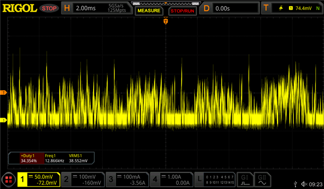 当我尝试 在 DRV8214 上使用齿轮箱运行小型直流电机时、IPROPI 没有显示任何明显的峰值。 除电机电阻反转标度和电机电阻反转的建议值外、没有更改任何设置。 电机具有 32mA 空闲电流和 835mA 阻断电流。 由于它已经适用于更大的电机、因此我想知道电机是否需要一定的空闲电流才能正常工作?