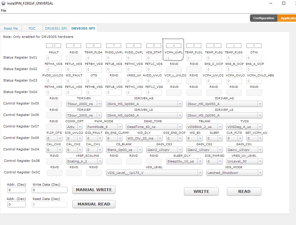 我自己设计 了DRV8305 bootxl ,用于与C2000 piccolo启动板配合使用。 我之前提到过关于instaspin_universal GUI { https://e2e.ti.com/support/applications/motor_drivers/f/38/t/57.458万 }中的SPI寄存器