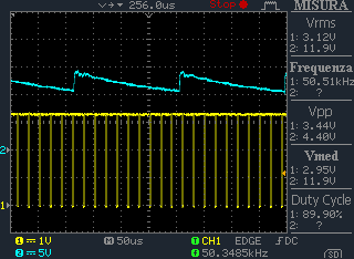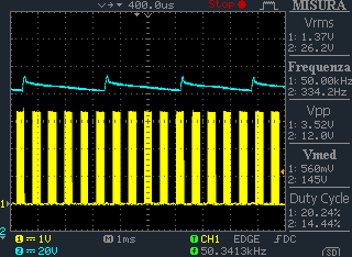 问题是高压输出出现大量纹波(50Vpp,只有大约20V设定点!!!) 无负载(印刷电路板上仅安装了库存1nF电容器)。 如果电容负载增加,纹波会降低,频率会改变,但会保持相当高的水平。 您实际上可以听到压电元件发出的噪音,该元件在该频率下振动。 此评估板是以某种方式损坏还是因为DRV2700的回扫配置的限制?