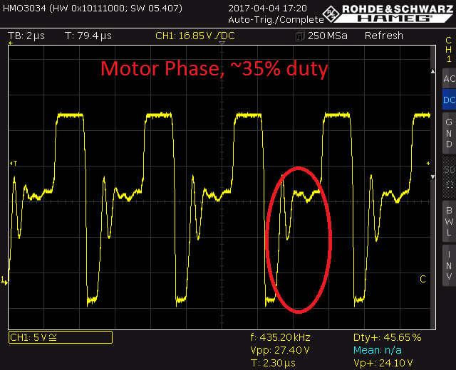 我正在设计中使用DRV8305电机驱动器和CSD1.854万Q5B MOSFET。 在非%100占空比下行驶时,FET的栅极电压(也包括相位电压)在两个周期之间不会保持低电平。 在不同的工作条件下行驶时,在此连接门电压和相电压。