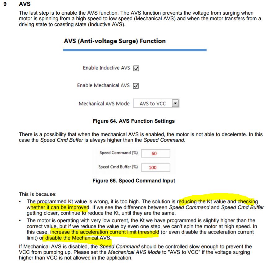听起来客户可能已启用机械AVS,以防止在降加速时电源电压出现喘振。 设备已确定降速不安全,因为减速会导致电源电压出现电涌。 在 "Mechanical AVS"(机械AVS)部分的"DRV1.0983万 Tuning guide (DRV1.0983万调谐指南)"中可以找到一些解决方法。 我已在上复制了下面的屏幕截图。 请检查标准是否与客户问题匹配: