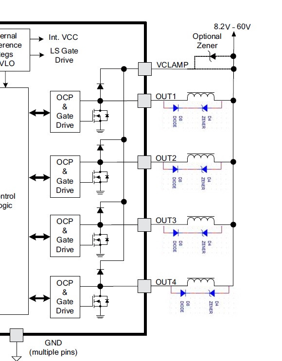DRV8803,DRV8806和DRV8860都可以使用外部齐纳二极管和回扫二极管,如图所示。 如果使用这些外部组件,请勿将任何东西连接到VCLAMP针脚。 电流将通过外部部件进行再循环。